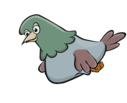 The Pigeon is one of the smallest characters in the game. Its lower body area is gray, with forest green-colored feathers covering the upper body. The upper body has eyes and a tan-like beak. The lower part has maroon wings and a feathered tail and two small orange feet.
