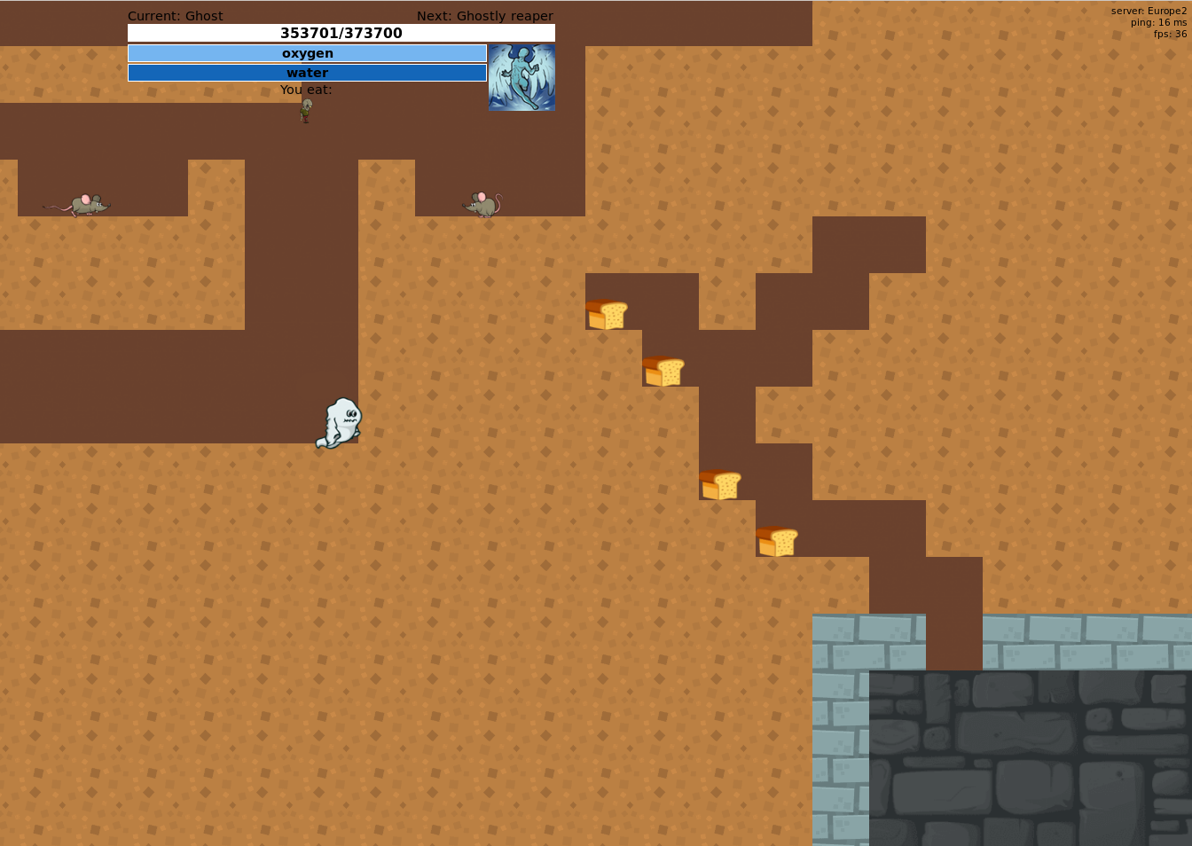 The underground is a tunnel labyrinth, full of mice and some bread, where three zombies guarding the only water in this biome is connected at the west side with two tunnels guarded by the Fire of Death (which leads to the Pit of Fire) in the east. Unless you are a Ghost or above, avoid touching the zombie or any exposure to the Fire of Death.